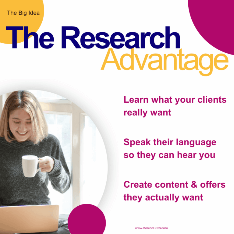 If you’re ready to stop second-guessing what your audience wants, show up confidently, build real relationships that lead to understanding your audience, creating offers they love, and growing your impact, The Research Advantage is your next step.